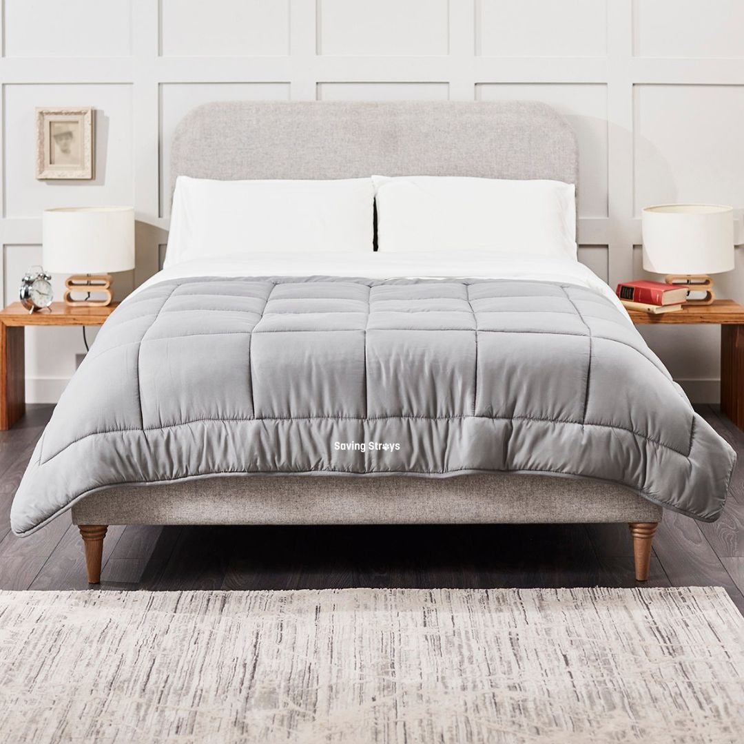 Lightweight Quick quilt, 135 x 200cm. Micro-touch reversible. Use as a quilt or throw. Complete with zipped duffle bag with carry handle, making it ideal for sleepovers or travelling, combined with our Saving Strays logo to the hem.